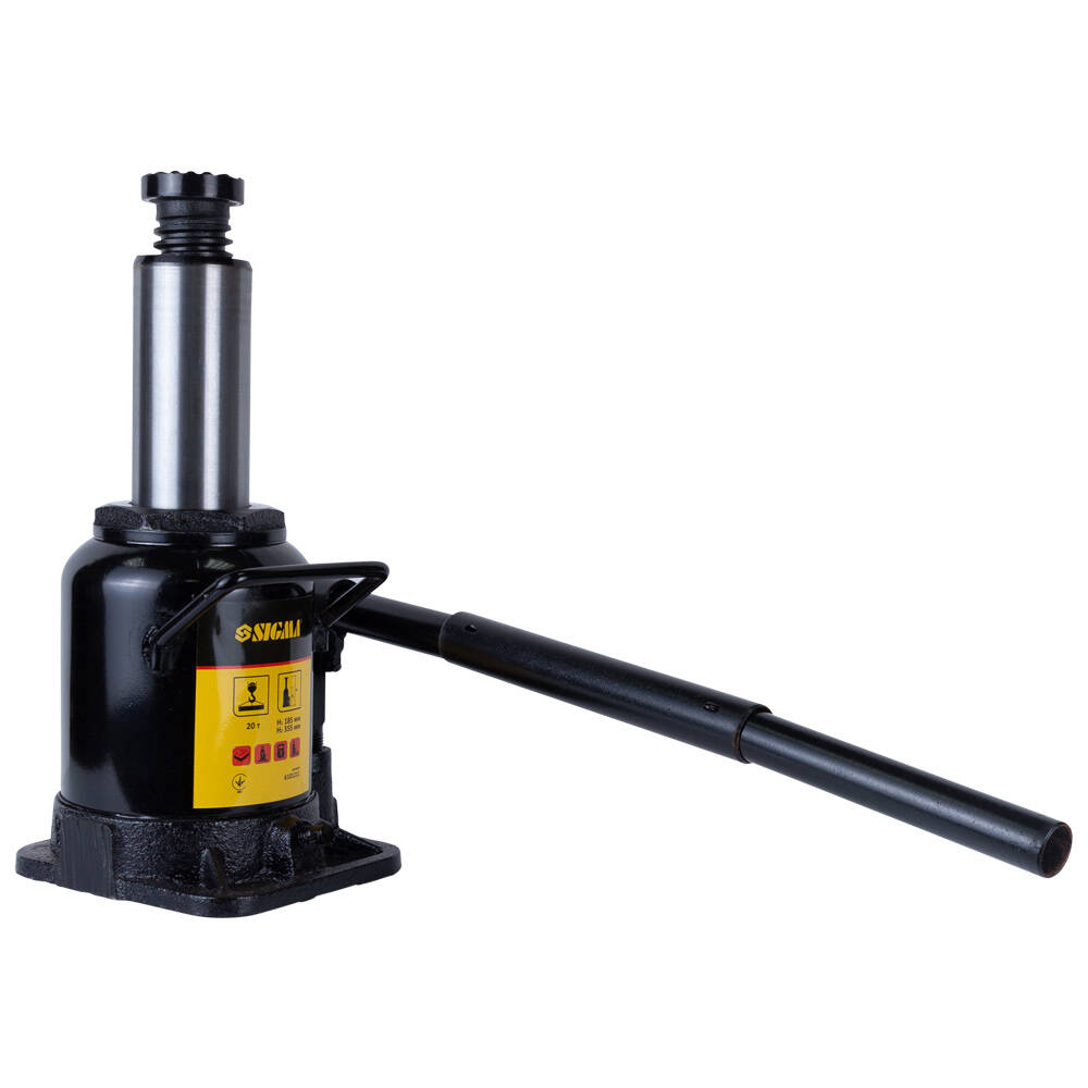 Домкрат гідравлічний пляшковий низькопрофільний 20т H 185-355мм Sigma (6101211) відрізняється простотою конструкції і зручністю в експлуатації, що розширює область його застосування і дозволяє ефективно виконувати роботи будь-якої складності.