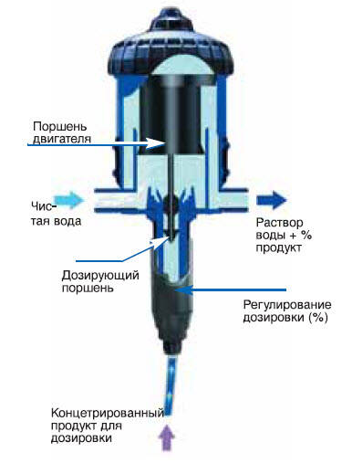 Підключений до мережі води Dosatron використовує тиск води в якості єдиної рушійної сили. Приводиться в дію таким чином: він всмоктує концентрований продукт, дозує з бажаним процентним вмістом, а потім перемішує з рушійною водою. Отриманий розчин прямує вниз по мережі. Доза продукту, що впорскується завжди пропорційна обсягу води, що проходить через Dosatron, незалежно від коливань витрати або тиску в мережі.