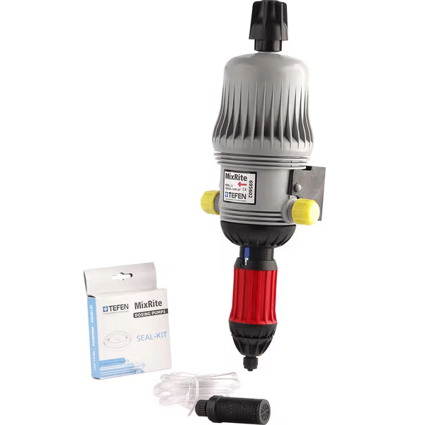 Дозатор з концентрацією 0,3 - 2%, MixRite 3.5, On/Off (0,16 - 58 л/хв) з боковим з'єднанням, призначений для точного дозування рідин у водопровідних системах. Це ідеальне рішення для сільськогосподарських підприємств, теплиць, а також для систем водопостачання птахівництва та тваринництва. Насос-дозатор MixRite представляє нове покоління дозаторів зі зменшеним мінімальним потоком. Завдяки новій конструкції важеля, дозатор працює навіть при потоці 7 л/год, що робить його ефективним навіть при низьких витратах води. Прилад не потребує зовнішніх джерел енергії — поршень приводиться в дію потоком води. Змішування відбувається шляхом пропорційного дозування речовини, яка точно змішується з водою.