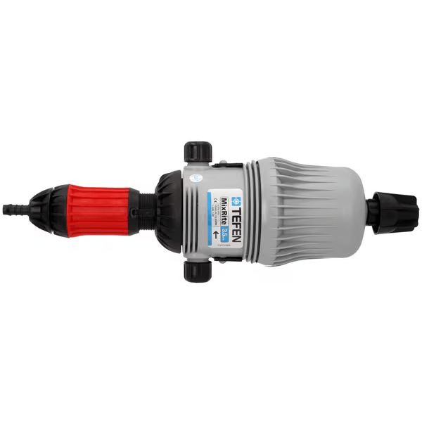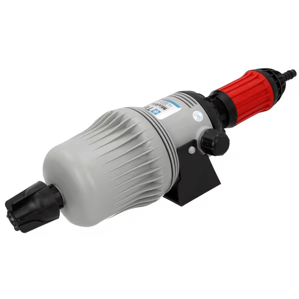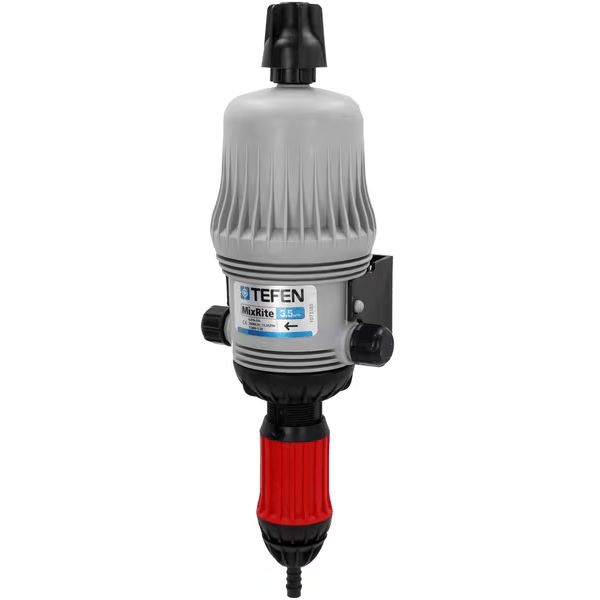 Дозатор хімічних речовин MixRite 3.5, 0.5-5, On/Off (0,16 - 58 л/хв) з боковим з'єднанням призначений для автоматичної підготовки розчинів, таких як дезінфікуючі засоби, мастильні рідини, хлорування та дезінфекція води. Прилад забезпечує точне дозування та змішування хімічних речовин із водою, без потреби в зовнішніх джерелах енергії. Насос MixRite 3.5 є новим поколінням дозаторів з покращеною конструкцією важеля, яка дозволяє працювати навіть при мінімальному потоці води — від 7 л/год. Завдяки пропорційному дозуванню, пристрій забезпечує рівномірне змішування рідин із водою, підтримуючи високу точність дозування. Система працює без необхідності підключення до електромережі, оскільки приводиться в дію потоком води.