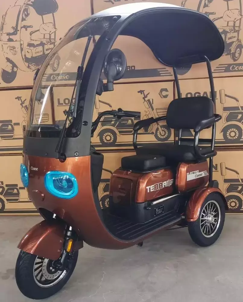 Привід від електродвигуна двигуна організований через понижуючий редуктор шестернясткового типу з двома напіввосьми нерівної довжини, що передає момент на задню тягову вісь електротрайка |