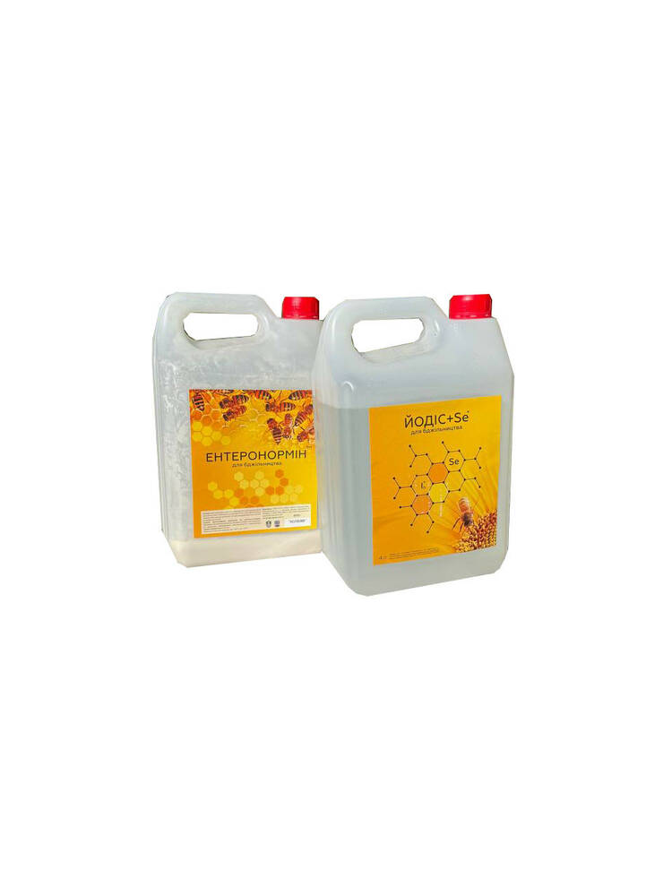 Ентеронормін з водним розчином Йодіс+Se (200 доз) 800г + 4000мл, пробіотик призначений для підвищення імунітету бджіл, стимуляції росту, профілактики та лікування вірусних, бактеріальних і грибкових захворювань таких як: Акарапідоз, Аскофероз, Гнилець, Нозематоз і інші вірусні захворювання. Надає, позитивне відновлюють дію, після потрави (отруєння) бджіл отрутохімікатами. Завдяки істотному підвищенню імунітету, бджола стає більш стійка до негативного впливу кліща Варроа.
