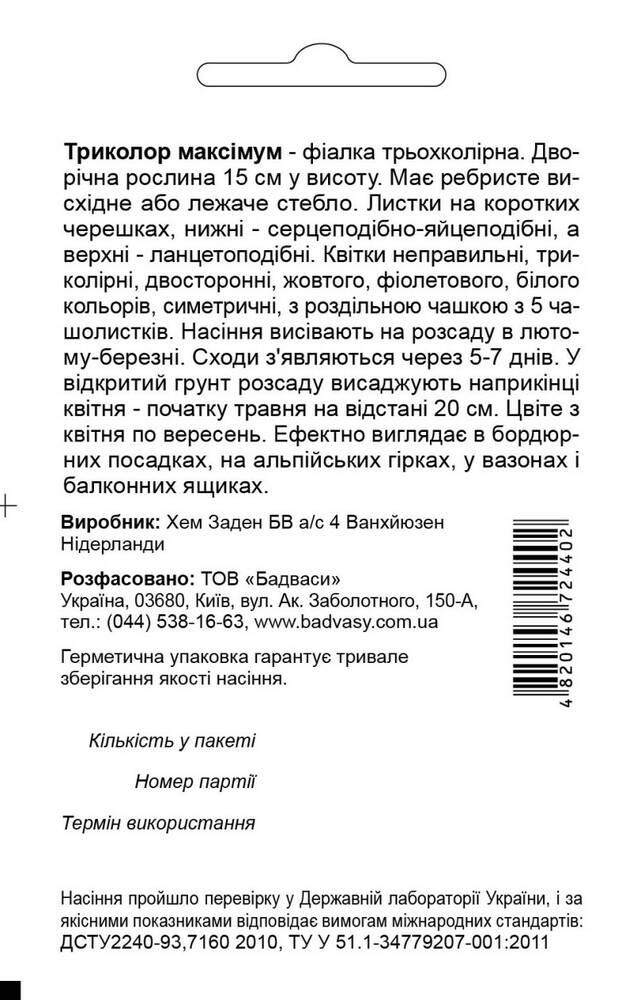 Фіалка Триколор Максимум F2 - фіалка трьохколірна. Дворічна рослина 15 см у висоту. Має ребристе висхідне або лежаче стебло. Листки на коротких черешках, нижні - серцеподібно-яйцеподібні, а верхні - ланцетоподібні. Квітки неправильні, триколірні, двосторонні, жовтого, фіолетового, білого кольорів, симетричні, з роздільною чашкою з 5 чашолистків. Насіння висівають на розсаду в лютому-березні. Сходи з'являються через 5-7 днів. У відкритий грунт розсаду висаджують наприкінці квітня - початку травня на відстані 20 см. Цвіте з квітня по вересень. Ефектно виглядає в бордюрних посадках, на альпійських гірках, у вазонах і балконних ящиках.