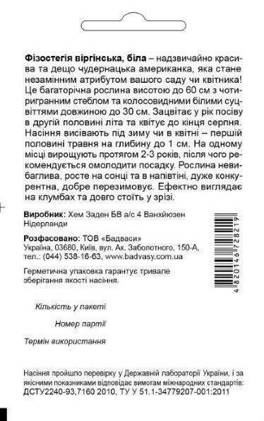 Фізостегія віргінська, біла – надзвичайно красива та дещо чудернацька американка, яка стане незамінним атрибутом вашого саду чи квітника! Це багаторічна рослина висотою до 60 см з чотиригранним стеблом та колосовидними білими суцвіттями довжиною до 30см. Зацвітає у рік посіву в другій половині літа та квітує до кінця серпня. Насіння висівають під зиму чи в квітні – першій половині травня на глибину до 1см. На одному місці вирощують протягом 2-3 років, після чого рекомендується омолодити посадку. Рослина невибаглива, росте на сонці та в напівтіні, дуже конкурентна, добре перезимовує. Ефектно виглядає на клумбах та довго стоїть у зрізі.