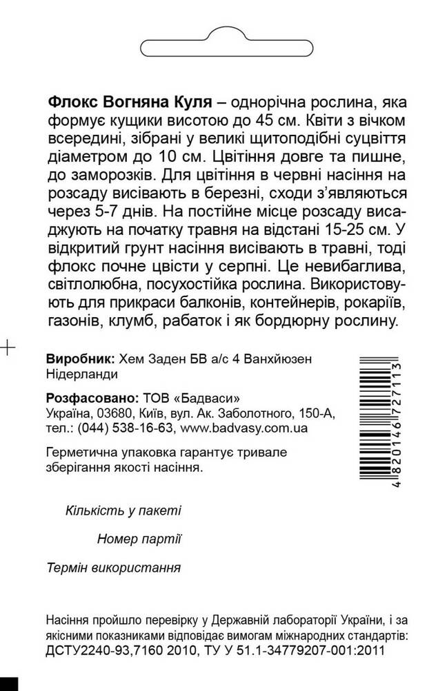 Флокс Вогняна Куля – однорічна рослина, яка формує кущики висотою до 45 см. Квіти з вічком всередині, зібрані у великі щитоподібні суцвіття діаметром до 10 см. Цвітіння довге та пишне, до заморозків. Для цвітіння в червні насіння на розсаду висівають в березні, сходи з’являються через 5-7 днів. На постійне місце розсаду висаджують на початку травня на відстані 15-25 см. У відкритий грунт насіння висівають в травні, тоді флокс почне цвісти у серпні. Це невибаглива, світлолюбна, посухостійка рослина. Використовують для прикраси балконів, контейнерів, рокаріїв, газонів, клумб, рабаток і як бордюрну рослину.