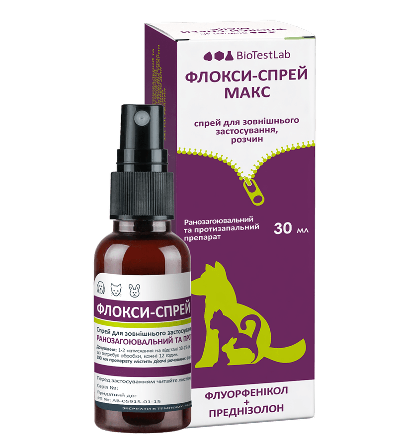 Флоксі-спрей макс - комплексний препарат з протимікробною, протизапальною, протиалергічною та протиексудативною дією, що обумовлено впливом діючих речовин препарату: антибіотика флуорфеніколу та глюкортикоїдів преднізолону. Флуорфенікол є похідним тіамфеніколу, в якому гідроксильна група заміщена атомом фтору, що зумовлює його антибактеріальну активність проти ацетилтрансферазосинтезуючих бактерій, чутливих до хлорамфеніколу. Флуорфенікол діє бактеріостатично на грампозитивні та грамнегативні бактерії, а саме: Fusobacterium necrophorum, Bacteroides melaninogenicus, Streptococcus spp., Staphylococcus spp., Pasteurеlla spp., Salmonella spp., Proteus, Pseudomonas. spp. , Chlamydia. Флуорфенікол пригнічує синтез білків у клітинах бактерій. У протоплазмі він зв'язується з 70S-рибосомними субодиницями, пригнічуючи ферментативну активність пептидилтрансфефарази, зменшуючи таким чином синтез білків у рибосомах відповідних бактерій.