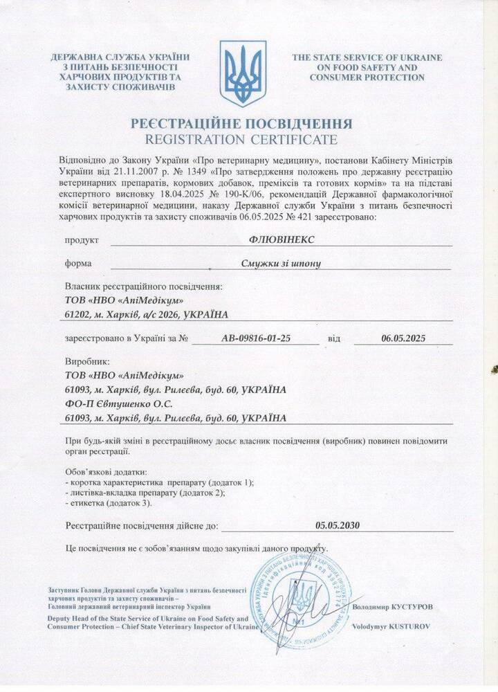 Зберігання: зберігати в оригінальній упаковці при температурі від + 4°С до + 25 °С у недоступному для дітей місці, окремо від харчових продуктів і кормів. Не допускати потрапляння прямих сонячних променів та вологи. Термін придатності: 36 місяців. Для застосування у ветеринарній медицині!