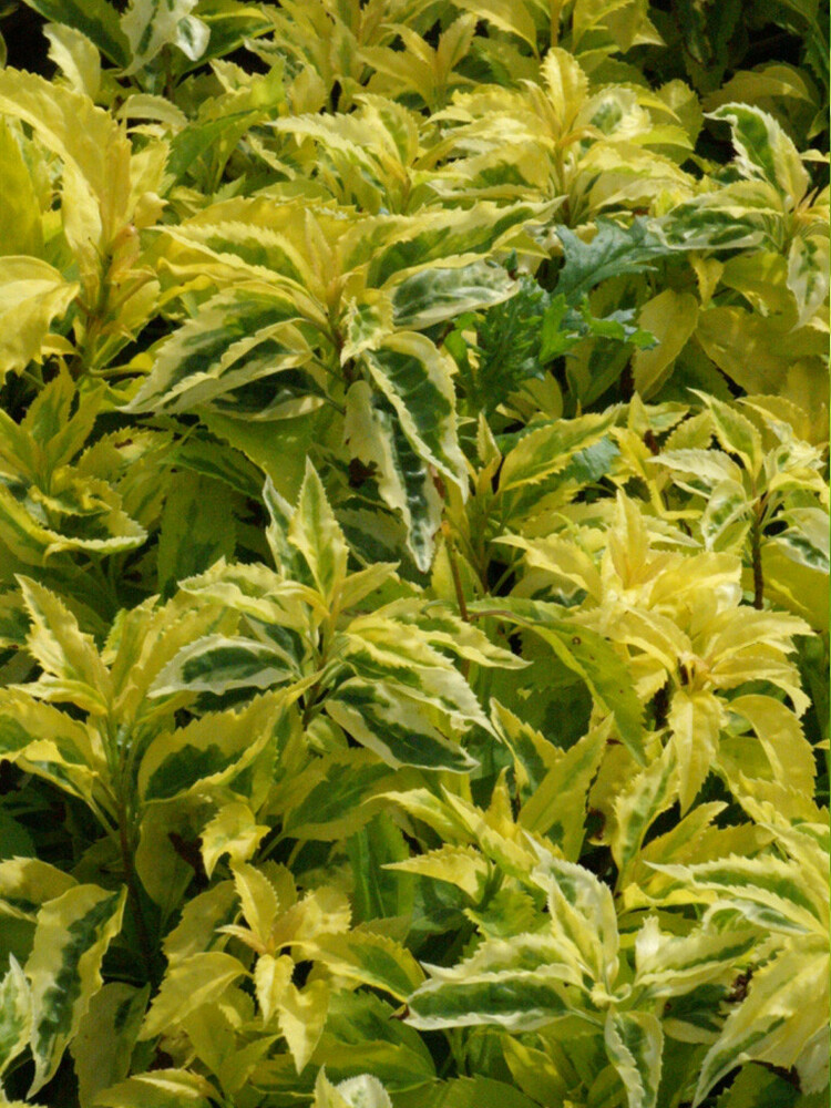 Листя: зазубрені по краю, строкаті, від темно-зелених до світло-зелених з золотисто-жовтою облямівкою, зі зворотнього боку світлі.