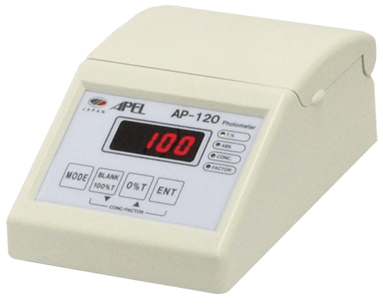 Фотоколориметр Ареl АР-120 - модернізований аналог фотоколориметра Apel AP-101, являє собою оптичний прилад для вимірювання концентрації речовин в розчинах. Дія колориметра заснована на властивості забарвлених розчинів поглинати світло, що проходить через них, тим сильніше, чим вище в них концентрація забарвлюючої речовини. Ареl АР-120 - простий в роботі фотоелектричний колориметр загального призначення, керований мікропроцесором. Дозволяє отримати надійні та точні результати при проведенні досліджень в різних областях ветеринарії та медицини.