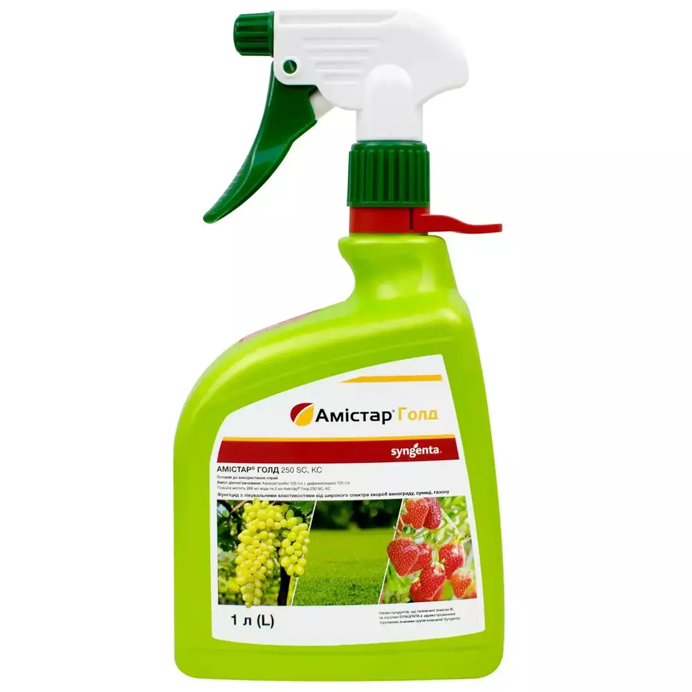 Розчин препарату Амістар Голд у флаконі з розпилювачем забезпечує захист винограду від мілдью, оїдіуму, антракнозу, суниці садової (полуниці) від білої та бурої плямистості, борошнистої роси; газону — від плямистості листя.
