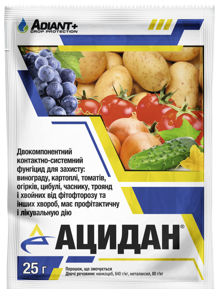Ацидан - Двухкомпонентный контактно-систеиний фунгицид для защиты: винограда, картофеля, томатов, огурцов, лука, чеснока, роз, хвойных от фитофтороза и других болезней, имеет профилактическое и лечебное действие.