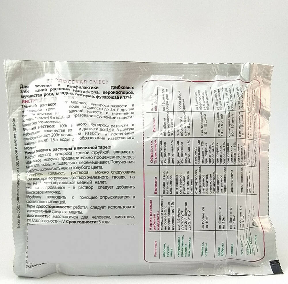 Действующее вещество: медный купорос - 100 гр и гашеная известь - 200 гр.