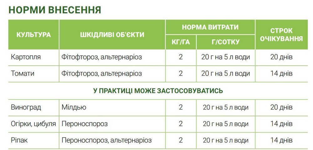 Рабочий раствор необходимо использовать в течение нескольких часов после приготовления. Наиболее благоприятное время для внесения препарата утром или вечером. С целью получения максимальной эффективности, необходимо обеспечить достаточное и равномерное опрыскивание надземной части растений. После обработки препарат быстро проникает в растение и распространяется по нему, надежно защищая от болезней. На овощных культурах первая обработка проводится, как правило, при наступлении благоприятных для развития патогенов климатических условий; профилактически - до появления первых признаков заболевания, но до смыкания рядков культуры. Следующие обработки проводятся через 10 - 14 дней. На рапсе обработку проводят при появлении первых признаков поражения болезнями. Следующую - через 10 - 14 дней. На виноградниках препарат целесообразно применять превентивно (профилактически), до появления симптомов заболевания. Опоздание с проведением обработки приводит к снижению эффективности действия препарата. Ручные работы на посевах следует проводить не ранее чем через 7 дней после обработки, а механизированные - через 3.