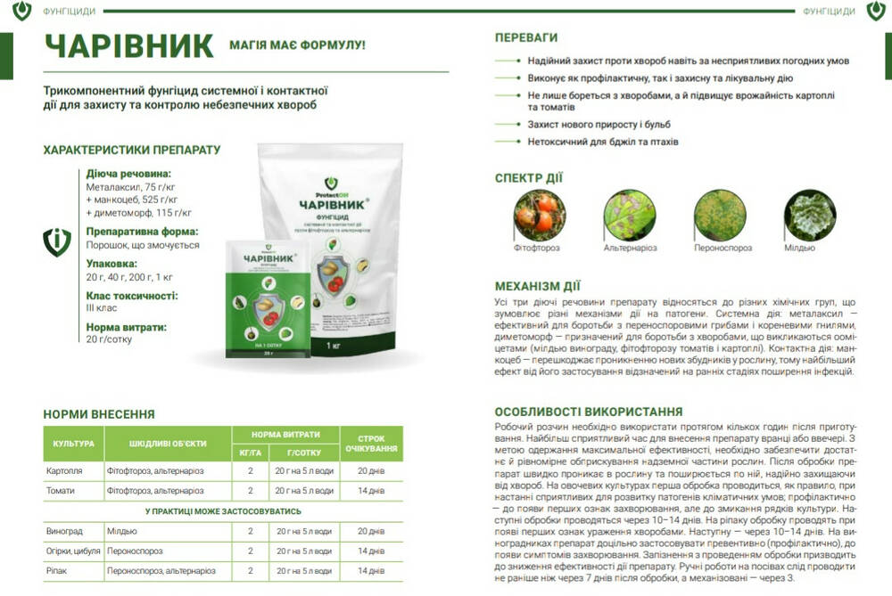 Чаривник - Трехкомпонентный фунгицид системного и контактного действия для защиты и контроля опасных болезней.