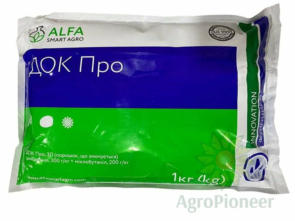 Док Про благодаря активным веществам (цимоксанил и миклобутанил) обладает чрезвычайным лечебным действием. Уничтожение патогена происходит даже через 1-3 дня после заражения за счет капсулирования инфицированных клеток растения. Высокая растворимость действующих веществ обеспечивает быстрое распространение фунгицида по растению и быстрый «стоп-эффект».