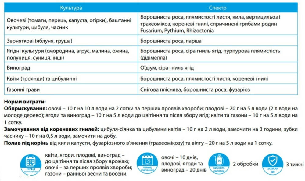 Период применения: цветы, ягоды, плодовые, виноград - до цветения и после сбора урожая; овощи - при первых проявлениях болезни; газоны - ранней весной и осенью.