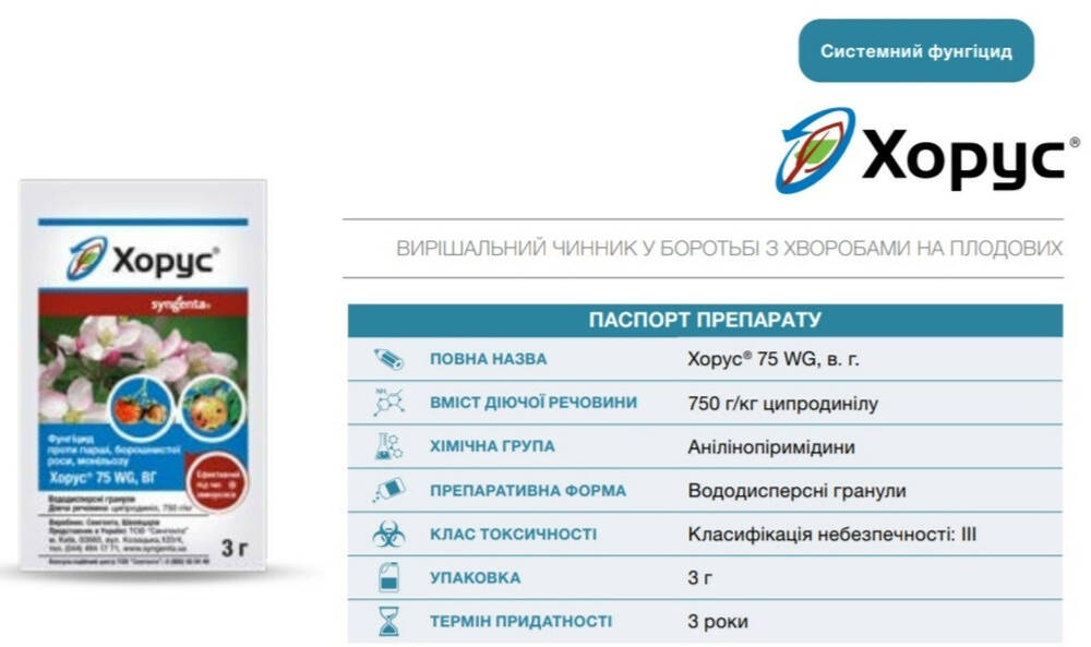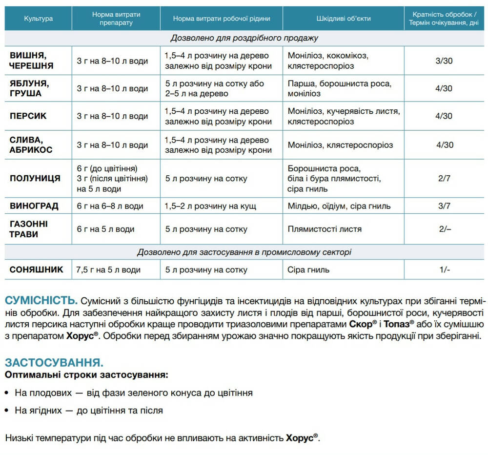 Хорус - чрезвычайно эффективный с уникальным механизмом действия фунгицид против возбудителей таких болезней, как парша, мучнистая роса, монилиоз. Кроме того, препарат надежно действует при низких температурах (+5°С), имеет трансламинарное и контактное действия. Последнее опрыскивание перед уборкой урожая существенно улучшает лежкость плодов в хранилищах. Снижает потери от гнилей на 30-40%. Хорус чрезвычайно эффективен против монилиального ожога косточковых (вишня, абрикос, слива, алыча, черешня) и курчавости листьев персика. Препарат обладает высокой эффективностью против различных видов гнилей плодов, ягод и винограда. Лечебное действие - 2 суток, защитное - 10-12 дней. Безопасен для пчел, полезных насекомых и окружающей среды. Относится к малотоксичным препаратам (ЛД50>2000 мг/кг). Применение препарата в фазе распускания почек и розового бутона гарантирует высокую эффективность последующих фунгицидных обработок.