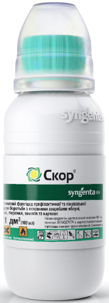Скор быстро (в течение 30 минут) проникает в растение и проявляет биологическую активность независимо от погодных условий. Биологическая активность препарата позволяет сохранить зеленый листовой аппарат до поздней осени, благодаря чему большое количество пластических веществ накапливается в почках и плодовых формированиях.