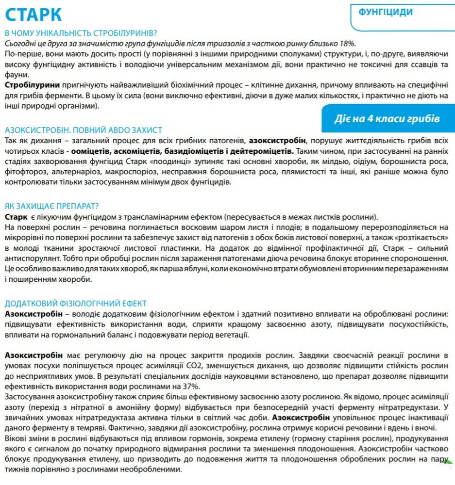 Азоксистробин - действующее вещество фунгицида Старк - стробилуриновый компонент, обладающий дополнительным физиологическим эффектом и способен физиологически положительно влиять на обрабатываемые растения: повышать эффективность использования воды, способствовать лучшему усвоению азота, влиять на гормональный баланс и продлевать период вегетации.