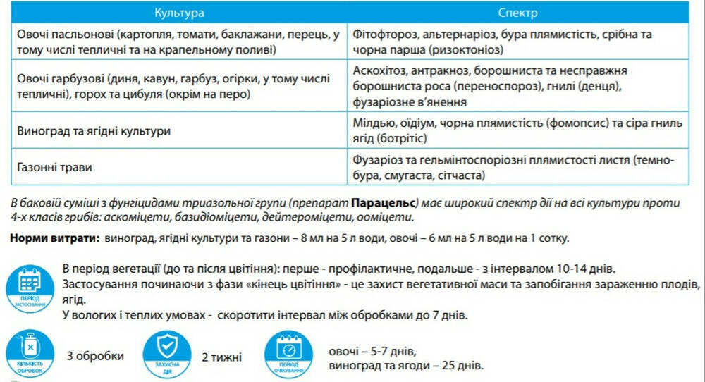 В баковой смеси с фунгицидами триазольной группы (препарат Парацельс) имеет широкий спектр действия на все культуры против 4-х классов грибов: аскомицеты, базидиомицеты, дейтеромицеты, оомицеты.