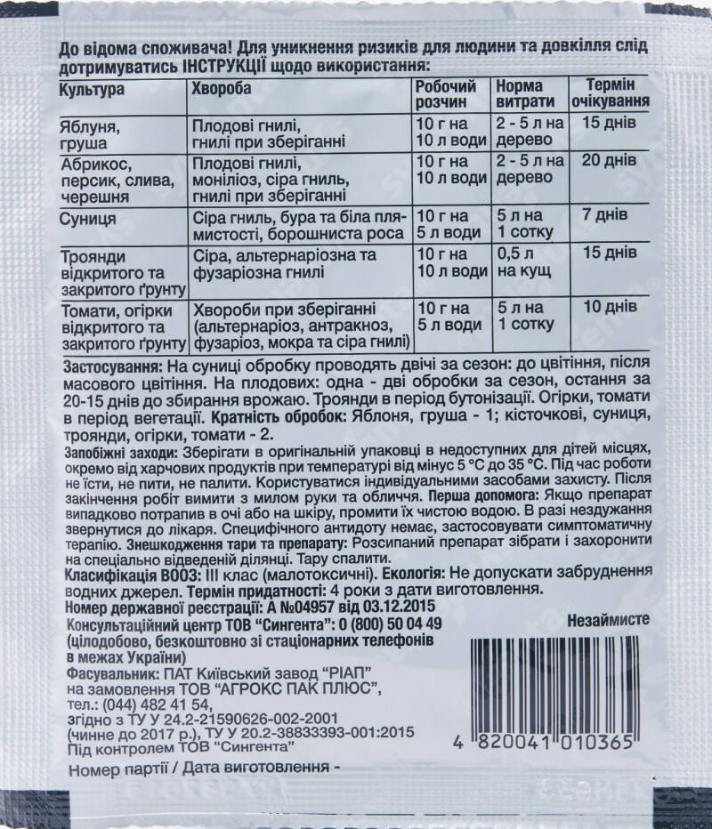 Спектр дії: фузаріозна гниль, альтернаріоз, аскохітоз, борошниста роса, гнилі, моніліоз, плодова гниль, плямистості, сіра гниль.