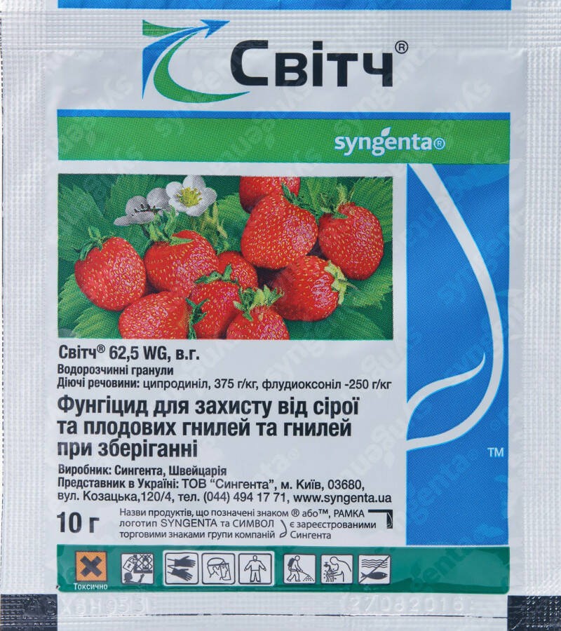 Фунгіцид Світч від Syngenta – призначений для захисту овочевих, плодових та ягідних культур проти широкого спектра грибкових захворювань. Препарат швейцарського бренду Сингента має високу ефективність – він діє і як контактний, і як системний засіб завдяки наявності 2-х активних компонентів, що значно підвищує фунгіцидний ефект.