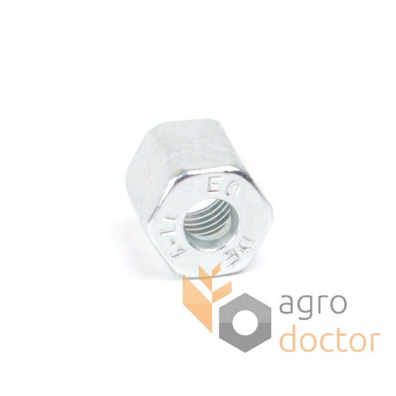 Сталева деталь у вигляді шестикутної призми з буртиком та центральним різьбовим отвором.