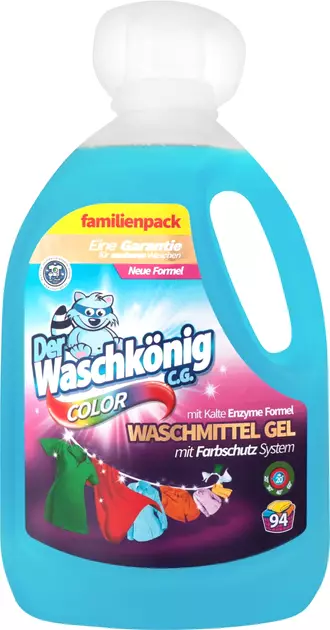 Der Waschkönig Color розроблений спеціально для дбайливого догляду за кольоровим одягом. Його формула ефективно видаляє бруд та плями, одночасно захищаючи тканини від втрати яскравості. Завдяки системі захисту кольору, ваш одяг навіть після численних прань виглядає як новий – насичений і яскравий.