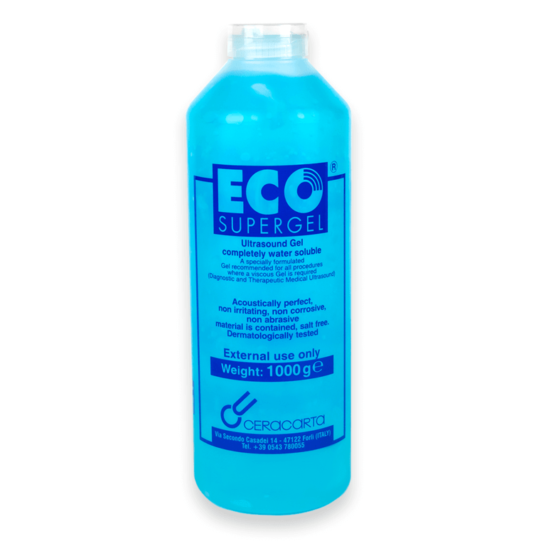 Гель для УЗД Eco Supergel від італійського виробника Ceracarta широко використовується у всьому світі. Цей універсальний контактний гель характеризується середнім ступенем в'язкості і щільності, що пояснює його широке застосування при ультразвукових дослідженнях, терапії, доплерографії в медицині і ветеринарії. PH гелю знаходиться на рівні 6, що є оптимальним і для шкіри пацієнта і для поверхні приладів і датчиків.