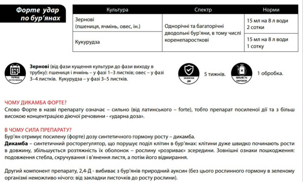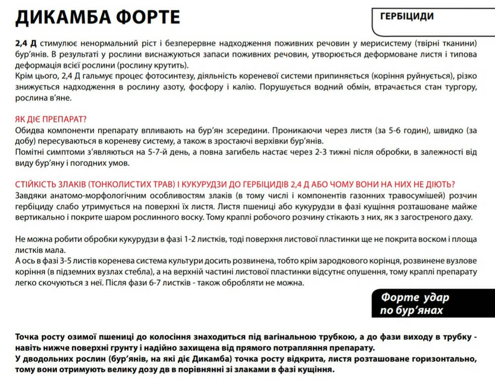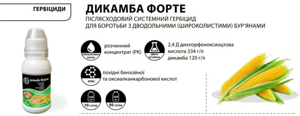 Дикамба Форте - Послевсходовый системный гербицид для борьбы с однолетними и многолетними двудольными (широколиственными) сорняками, в т.ч. устойчивыми к 2,4-Д и МЦПА, в посевах озимой пшеницы, ярового ячменя, кукурузы, на газонах.