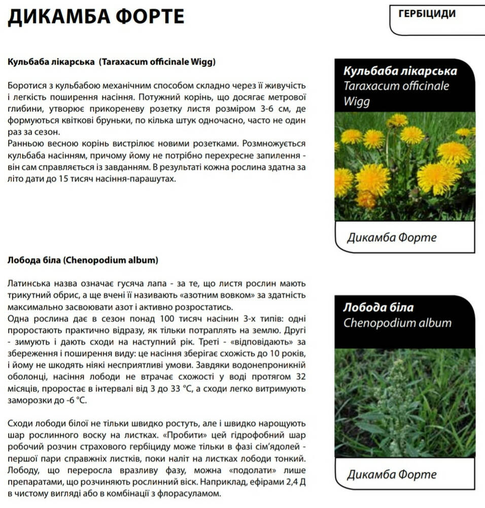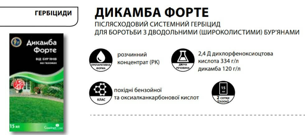 Дикамба Форте - Послевсходовый системный гербицид для борьбы с однолетними и многолетними двудольными (широколиственными) сорняками, в т.ч. устойчивыми к 2,4-Д и МЦПА на газонах.