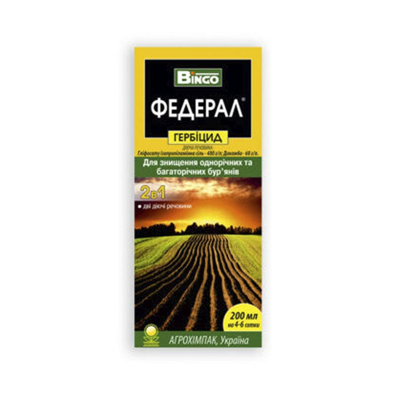 Гербіцид Федерал – комбінований системний гербіцид суцільної дії для повного знищення всіх видів бур'янів на ділянках після збирання врожаю, на парах та землях несільськогосподарського призначення. Завдяки використанню в препараті другої діючої речовини, дикамби, гербіцид ще більш ефективний у боротьбі зі стійкими широколистими бур’янами.