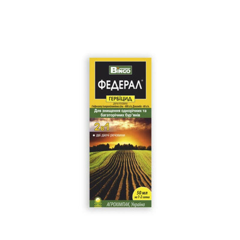 Гербіцид Федерал – комбінований системний гербіцид суцільної дії для повного знищення всіх видів бур'янів на ділянках після збирання врожаю, на парах та землях несільськогосподарського призначення. Завдяки використанню в препараті другої діючої речовини, дикамби, гербіцид ще більш ефективний у боротьбі зі стійкими широколистими бур’янами.