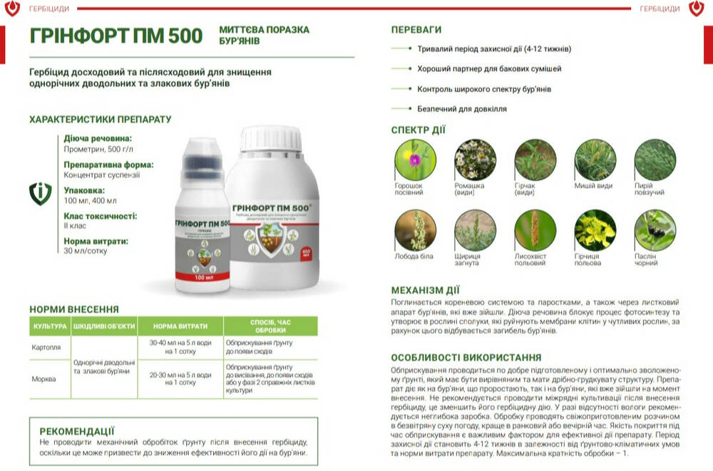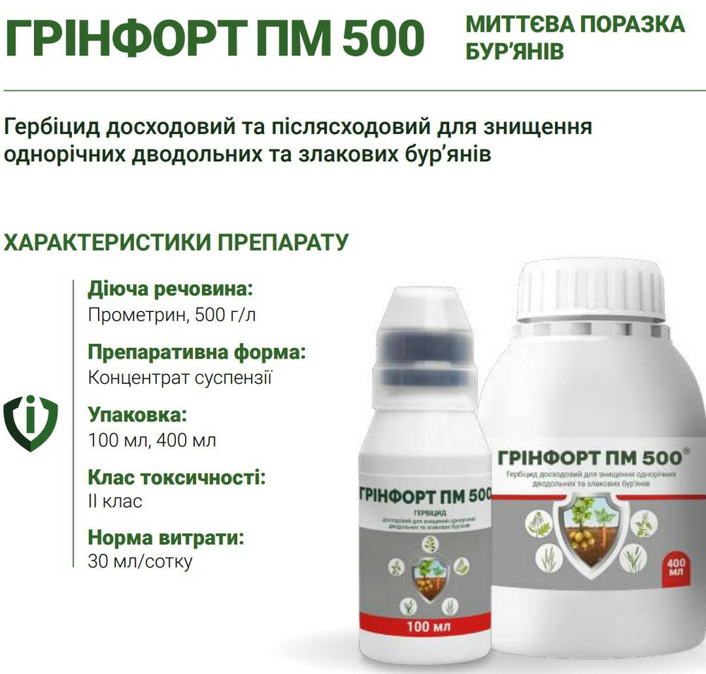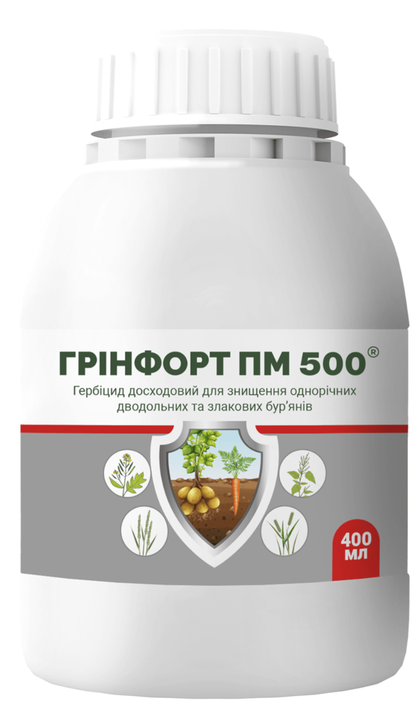 Гринфорт ПМ 500 - Гербицид довсходовый и послевсходовый для уничтожения однолетних двудольных и злаковых сорняков.