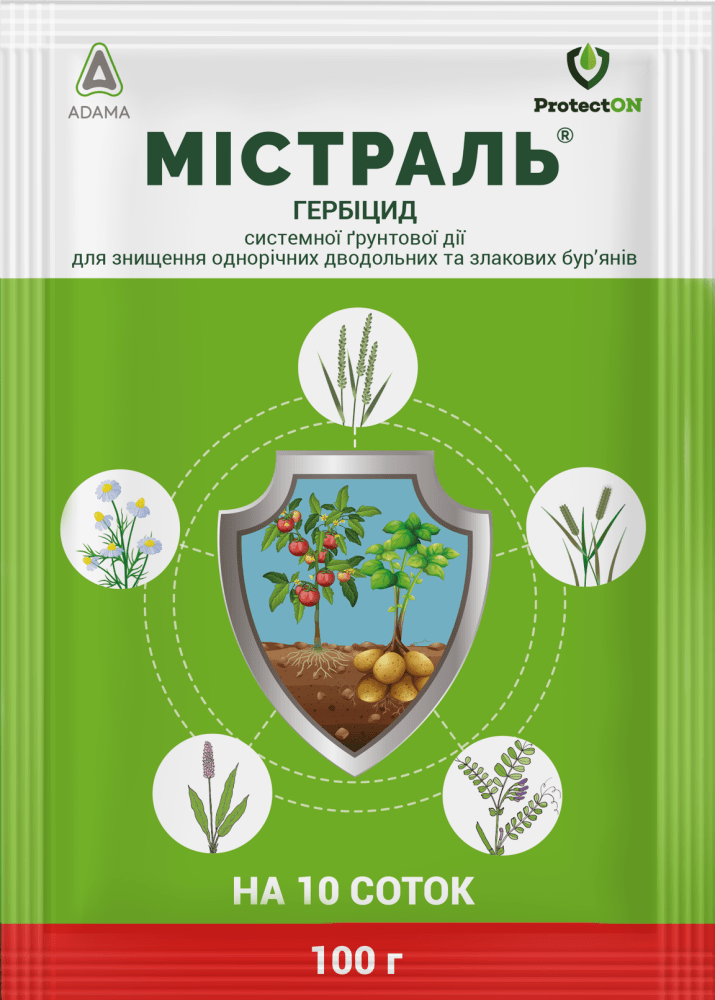 Гербіцид Містраль, ProtectON – ефективний препарат для захисту від бур'янів молодих посадок томатів та картоплі. Засіб селективної дії не завдає шкоди основній культурі, знищує тільки бур'яни, блокуючи в них процес фотосинтезу. Ефективний проти однорічних дводольних і злакових бур'янів, серед них горошок посівний, різні види ромашки, гірчак, мишій, пирій повзучий. Щоб уникнути малоефективних підробок, варто купити гербіцид Містраль у нашому інтернет-магазині, що гарантує справжність гербіцидних препаратів.