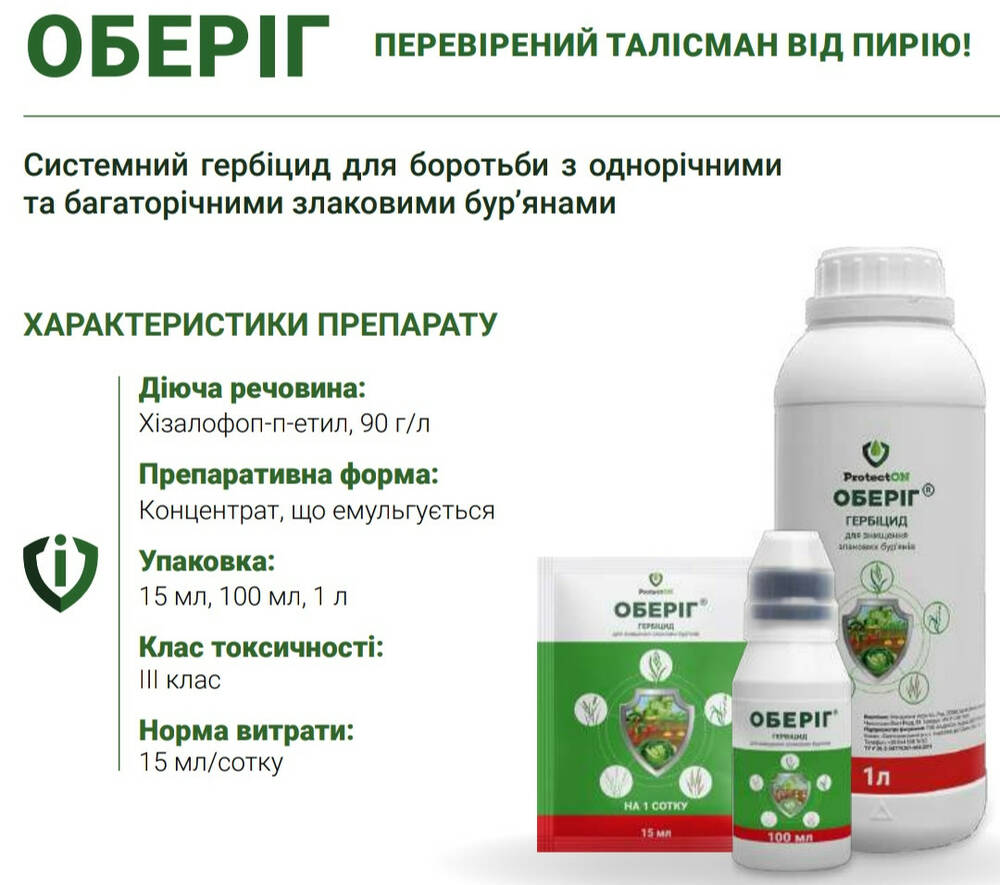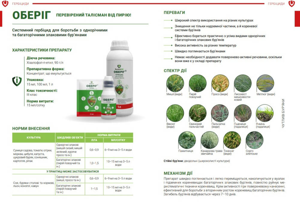 Обериг - Системный гербицид для борьбы с однолетними и многолетними злаковыми сорняками.