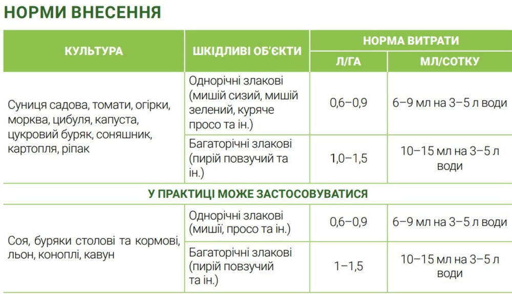 Клубника садовая, томаты, огурцы, морковь, лук, капуста, сахарная свекла, подсолнух, картофель, рапс Однолетние злаковые (щетинник сизый, щетинник зеленый, куриное просо и др.) 0,6-0,9 6-9 мл на 3-5 л воды