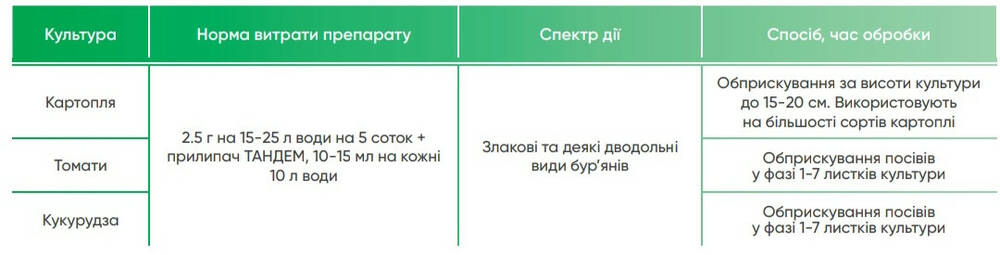 Картофель 2.5 г на 15-25 л воды на 5 соток + прилипатель Тандем, 10-15 мл на каждые 10 л воды Злаковые и некоторые двудольные виды сорняков Опрыскивание при высоте культуры до 15-20 см. Используют на большинстве сортов картофеля