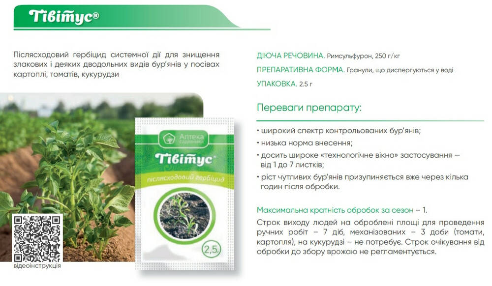 Тивитус - Послевсходовый гербицид системного действия для уничтожения злаковых и некоторых двудольных видов сорняков в посевах картофеля, томатов, кукурузы.