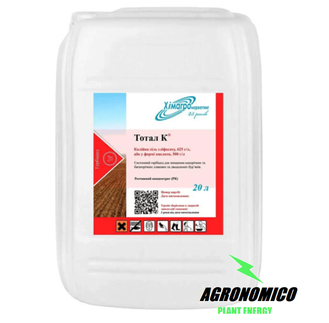 Гербіцид Тотал К 20 л - системний гербіцид суцільної дії для боротьби з широким спектром однорічних та багаторічних бур'янів на сільськогосподарських угіддях та землях не сільськогосподарського призначення. Десикант для зернобобових та соняшнику.