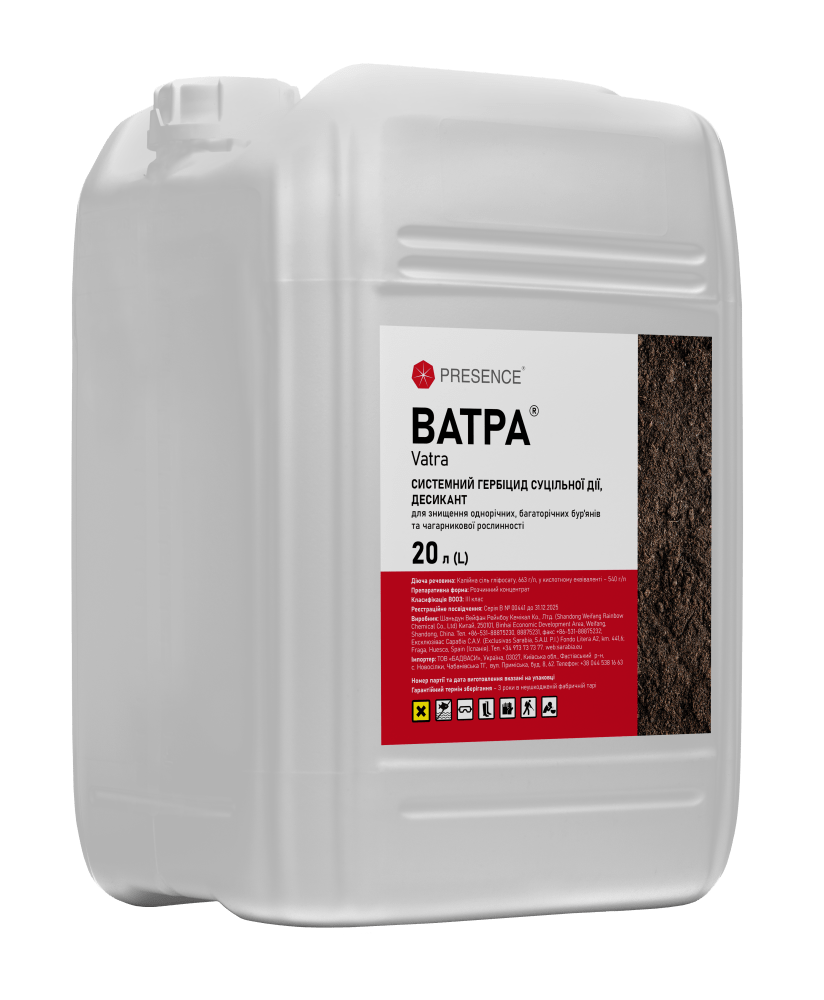 Гербіцид Ватра – це системний гербіцид суцільної дії, десикант для знищення однорічних і багаторічних бур’янів, в т. ч. чагарникової рослинності.