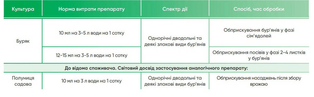 | Свекла | 10 мл на 3-5 л воды на 1 сотку | Однолетние двудольные и некоторые злаковые виды сорняков | Опрыскивание сорняков в фазе семядолей |