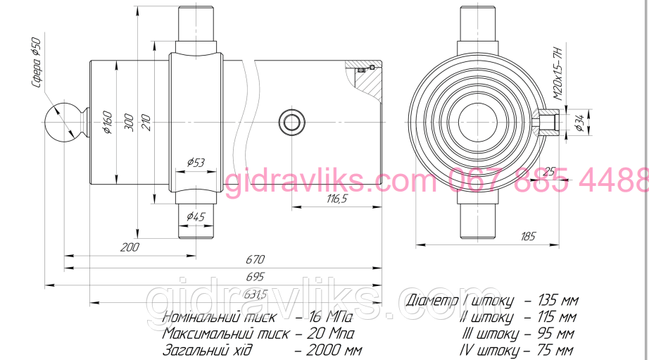 Діаметри штоків: 135 / 115 / 95 / 75 мм