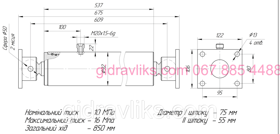 Гідроциліндр 1ПТС-9 підйому причепа Т-150, К-700 | 2-штоковий | 771-8603010 | ГЦ 111.02.014-09