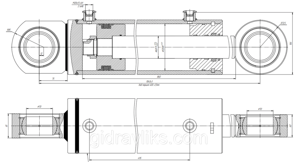 Гідроциліндр перекидання ковша ЦГ 125х63х400.11 для тракторів та навантажувачів Т-156, ТО-18А. Модель ГЦ125.63.400.1040.70 / ГЦ 111.01.032 23 розроблена для роботи під тиском до 200 бар, забезпечує штовхаюче зусилля 20 тс і тягнуче — 14,95 тс. Оптимізована конструкція гарантує довговічність, стійкість до високих навантажень та простоту обслуговування. Підходить для швидкої заміни штатних гідроциліндрів без додаткових доробок.