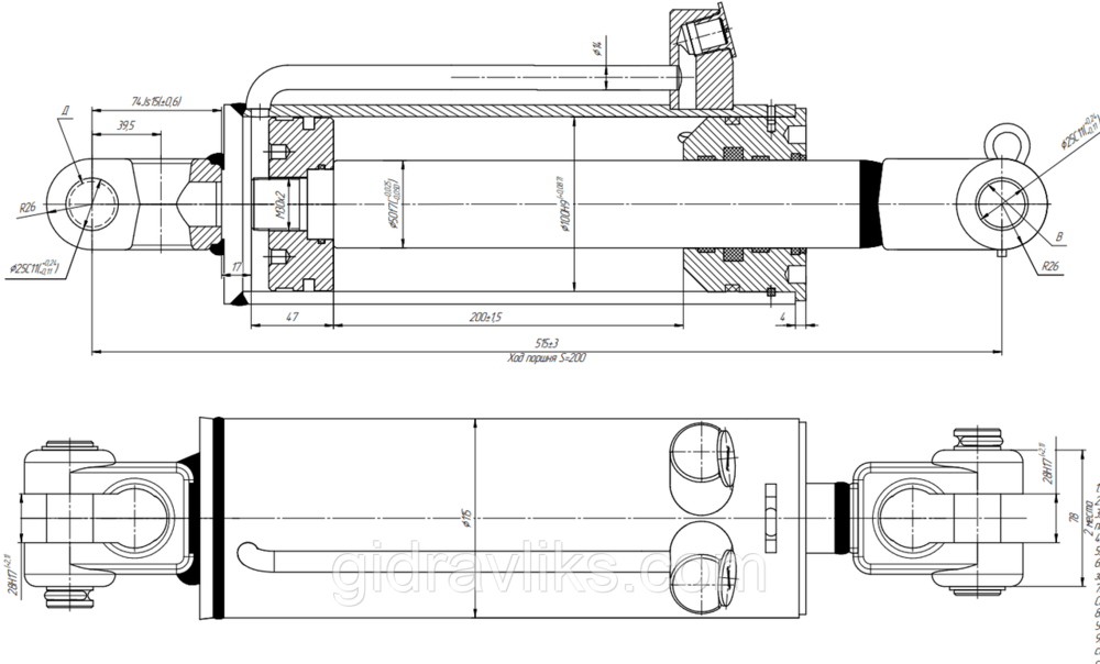 Гідроциліндр ЦС100 Н.О (ГЦ100х50х200.515) використовується в навісній системі тракторів ЮМЗ. Оснащений рогатим штоком діаметром 50 мм, що забезпечує підвищену міцність та довговічність при експлуатації. Поставляється у комплекті з пальцями для кріплення, що спрощує монтаж.