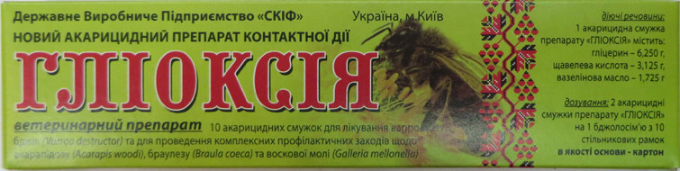 Смужки Гліоксія – призначені для лікування вароатозу бджіл (Varroa destructor), та для проведення комплексних профілактичних заходів з акарапідозу (Acarapis woodi), браулезу (Braula coeca, вошивість бджіл) та воскової молі (Galleria mellonella).