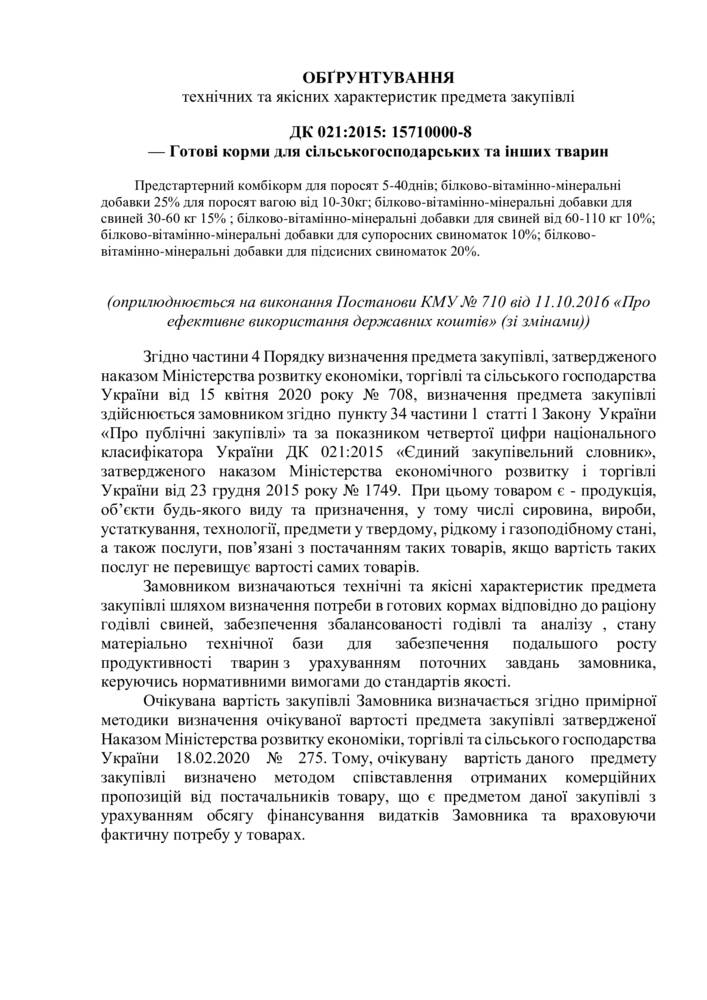 Замовником визначаються технічні та якісні характеристик предмета закупівлі шляхом визначення потреби в готових кормах відповідно до раціону годівлі свиней, забезпечення збалансованості годівлі та аналізу , стану матеріально технічної бази для забезпечення подальшого росту продуктивності тварин з урахуванням поточних завдань замовника, керуючись нормативними вимогами до стандартів якості.