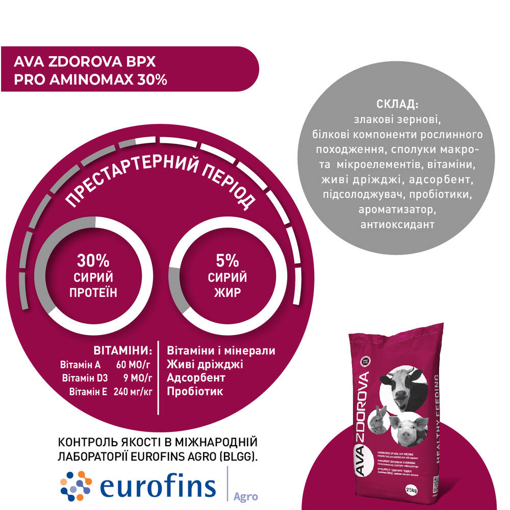 Спеціально розроблений концентрат AVA ZDOROVA ВРХ PRO AminoMax 30%, містить в своєму складі зернові, білкові компоненти рослинного походження, вітаміни, мінерали, пробіотики та інші складові, що забезпечують відмінну годівлю ваших телят, високе споживання корму, ріст рубцевих папіл, загальний розвиток організму, здорове травлення та високі показники продуктивності.