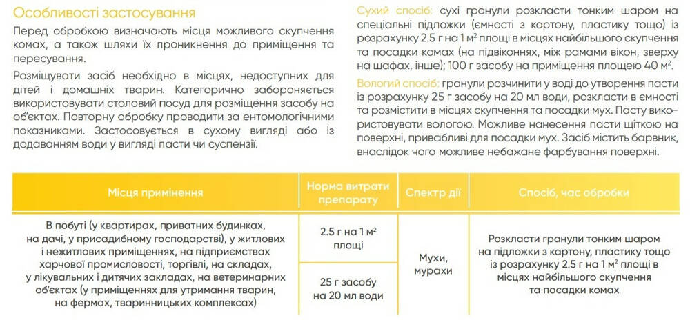 | В быту (в квартирах, частных домах, на даче, в приусадебном хозяйстве), в жилых и нежилых помещениях, на предприятиях пищевой промышленности, торговли, на складах, в лечебных и детских учреждениях, на ветеринарных объектах (в помещениях для содержания животных, на фермах, животноводческих комплексах) | 2.5 г на 1 м2 площади | Мухи, муравьи | Разложить гранулы тонким слоем на подложки из картона, пластика и т.д. из расчета 2.5 г на 1 м2 площади в местах наибольшего скопления и посадки насекомых |